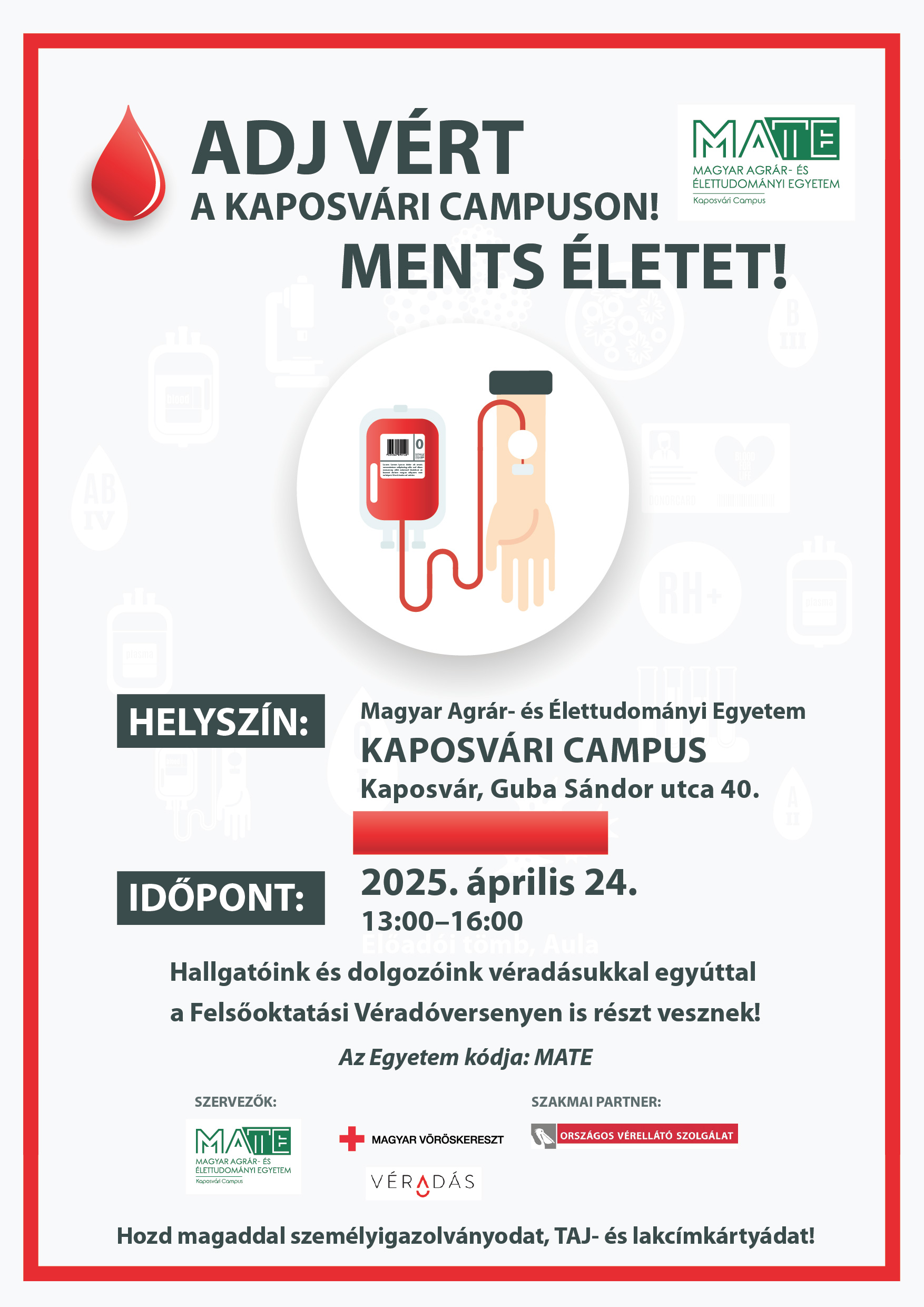 A MATE hallgatói és dolgozói ez alkalommal is csatlakozhatnak a Felsőoktatási Véradóversenyhez. Március 17-tól május 18-ig a Felsőoktatási Véradó Hetek programsorozat keretében intézményünkben is lesz lehetőség önkéntes véradásra! Csatlakozzon a kezdeményezéshez! Segítsen, hogy a 2025-ös versenyben a MATE érdemelje ki a Bátorság-díj Véradásért elismerést!